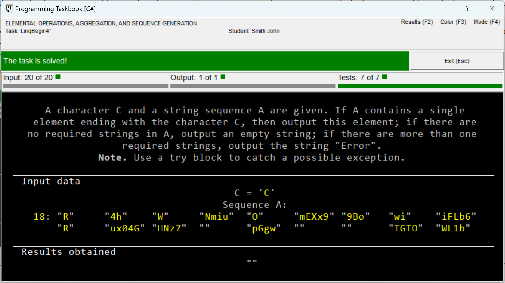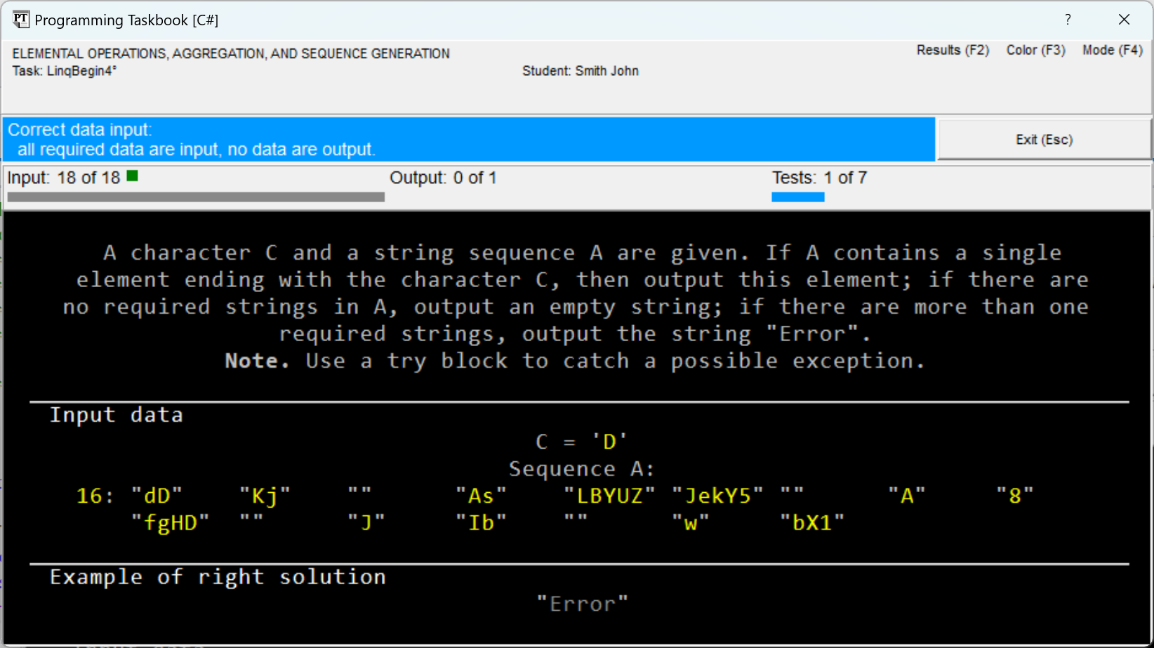 LinqBegin4°. A character C and a string sequence A are given. If A contains a single element ending with the character C, then output this element; if there are no required strings in A, output an empty string; if there are more than one required strings, output the string "Error". Note. Use a try block to catch a possible exception.