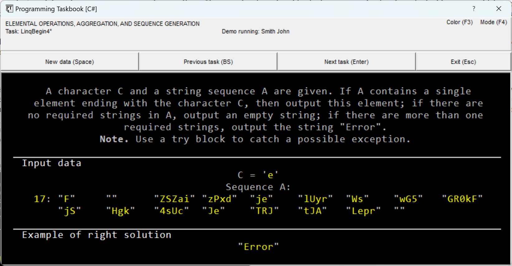 LinqBegin4°. A character C and a string sequence A are given. If A contains a single element ending with the character C, then output this element; if there are no required strings in A, output an empty string; if there are more than one required strings, output the string "Error". Note. Use a try block to catch a possible exception.